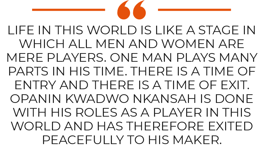 Opanin Kwadwo Nkansah fell sick briefly due to old age. The Almighty God whose ways are not our ways, beckoned His son to join Him peacefully on the evening of Thursday 14th November 2024 at the Atibie Government Hospital.